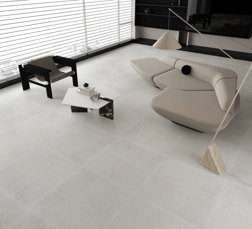 The softly shaded white tone, with its delicate natural variations, evokes the purity of natural stone while maintaining a clean, modern look. Each tile features gentle, organic patterns that enhance the visual richness of your floors.