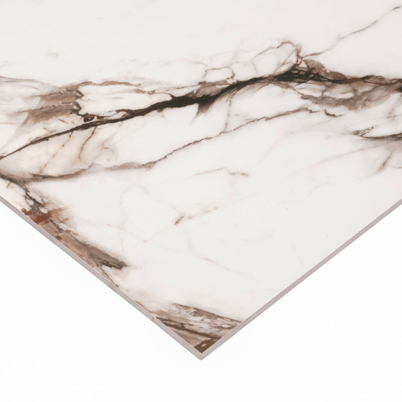 Discover absolute refinement with the Gold Marble Effect Ceramic – Oikos, a premium choice that instantly transforms any space. Inspired by the most prestigious marbles, it stands out with its bright white background crossed by rich veins in golden, caramel, and gray shades, creating a visual effect that is both warm and spectacular.