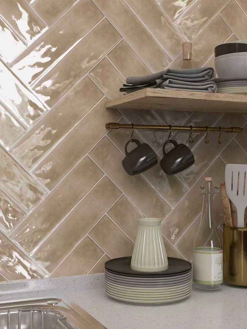 Bring warmth and elegance to your walls with the Greige Antique wall ceramic. Its refined shade between gray and beige, combined with a subtly wavy glossy finish, creates a unique play of light that instantly enhances your spaces.
