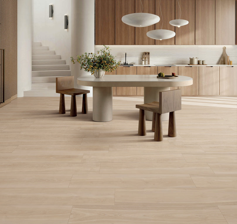 Its soft, light color creates a warm and clean aesthetic, ideal for Scandinavian, minimalist, or contemporary interiors. The large 8" x 48" format allows for an elegant installation with minimal visible joints, enhancing the effect of natural wood planks.