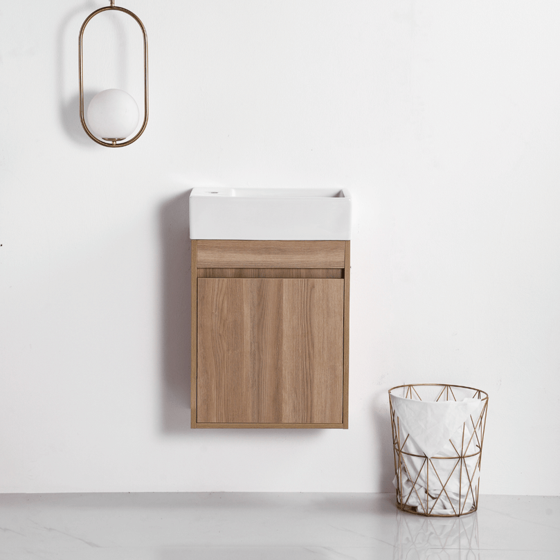This 18-inch wide vanity cabinet maximizes storage in small bathrooms. This freestanding full-overlay vanity features a Scandinavian transitional design. Additionally, its two-door cabinet offers extra storage and easy access to your plumbing. Constructed from quality wood, with a laminated wood door front, this freestanding vanity has a warm medium-tone wood grain appearance complemented by a porcelain vanity top. The one-piece vanity top includes an integrated rectangular sink and is pre-drilled to accommodate a faucet. Designed for quick installation around your existing plumbing.