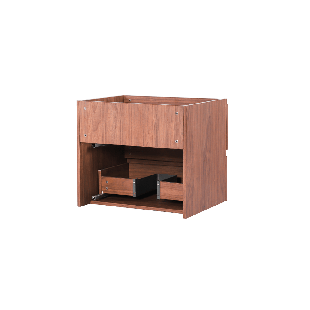 This 24-inch wide vanity cabinet maximizes storage in small bathrooms. This freestanding full-overlay vanity features a Scandinavian transitional design. Additionally, its two-door cabinet offers extra storage and easy access to your plumbing. Constructed from quality wood, with a laminated wood door front, this freestanding vanity has a warm medium-tone wood grain appearance complemented by a matte-finished micro crystal vanity top. The one-piece vanity top includes an integrated rectangular sink and is pre-drilled to accommodate a faucet. Designed for quick installation around your existing plumbing.